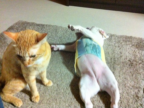 なんやってんやろう?虎丸を裏返して後ろ足を伸ばしたり肉球チェックしてわからん