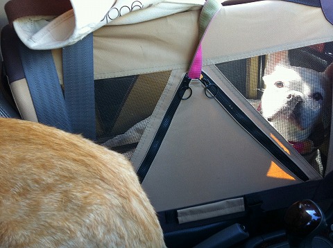 いつもは、後部座席にセットしたケージに居るhippieの横で落ち着いていたのに