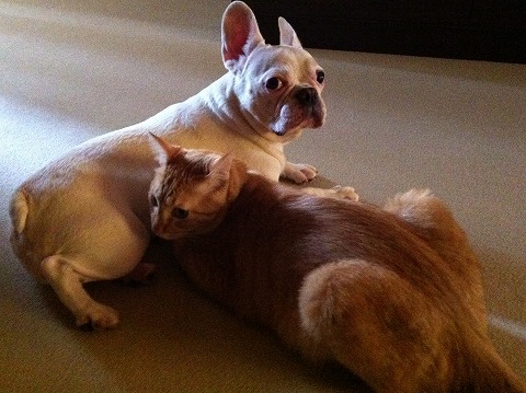 虎丸はhippieがハウスに入ると安心してcheeseのベッドに入ってくる