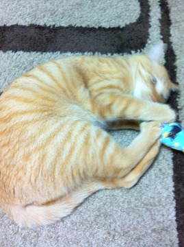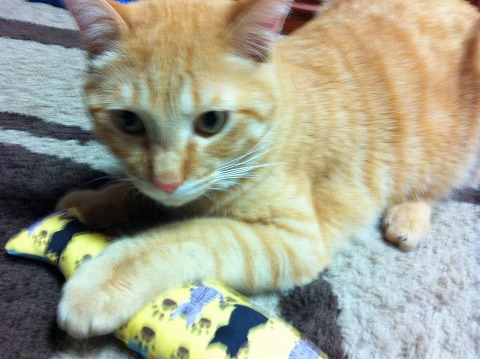 これ、猫用のおもちゃで抱っこして後ろ足でキックキックする物