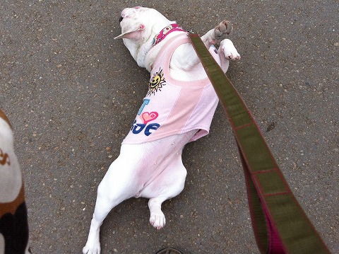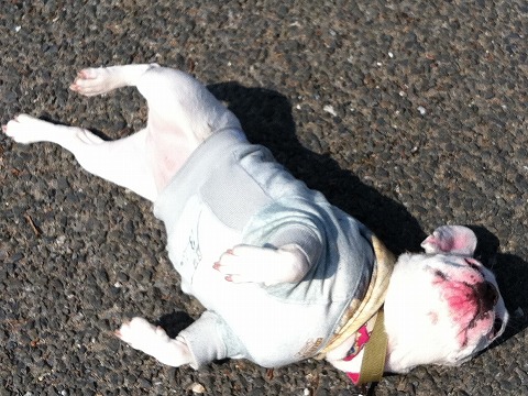 アスファルトで、アゴまで擦るから真っ赤ー!