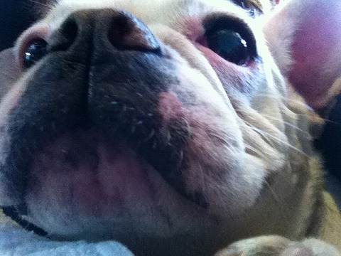 フレンチブルドッグhippieの肉球の上でコロコロ転がされる