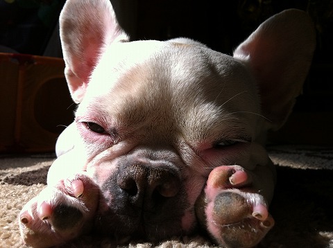 フレンチブルドッグhippieの肉球の上でコロコロ転がされる
