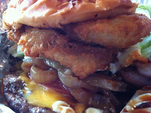 レギュラーバーガー(¥500)に、オニオンリング・ベーコン・チーズ(各¥100)トッピング