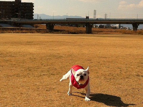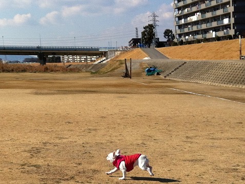 赤いちゃんちゃんこ着て、だ~れも居ないグランドへ