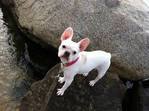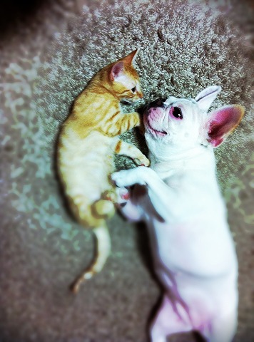 フレンチブルドッグhippieの肉球の上でコロコロ転がされる