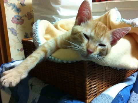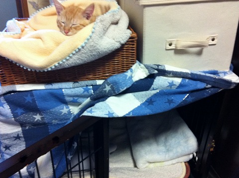 hippieのトイレシート入れのかごに、ベッドを入れると、やたら気に入った様子