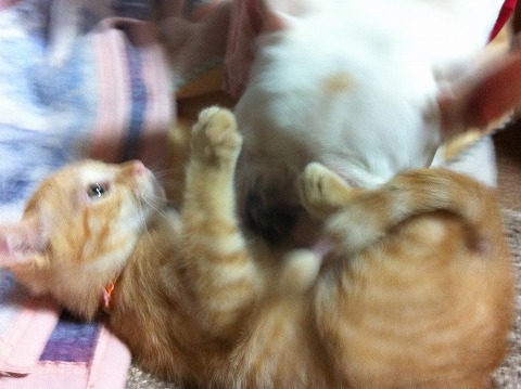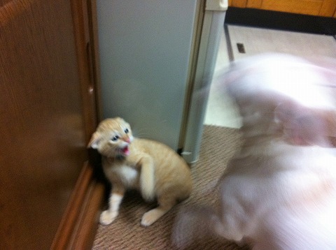 追い込む・・・でも、二日目からはニャンコも慣れてきたようで、逃げつつも遊んでるような?