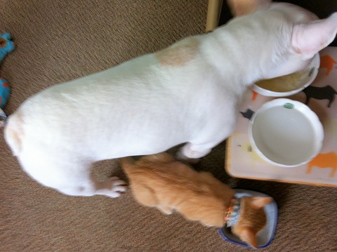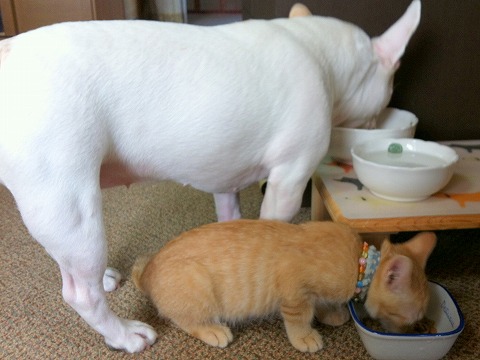 後からニャンコに出したら、hippieのお腹の下を通って食べ始めた(-ι_- ))