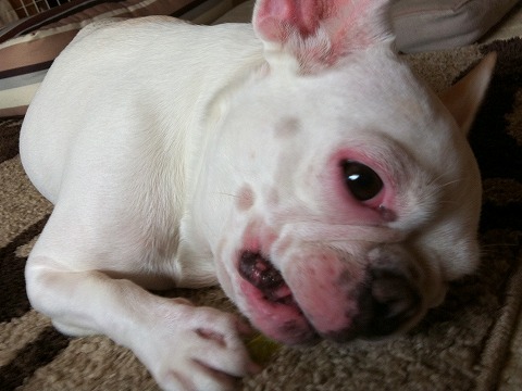 フレンチブルドッグhippieの肉球の上でコロコロ転がされる