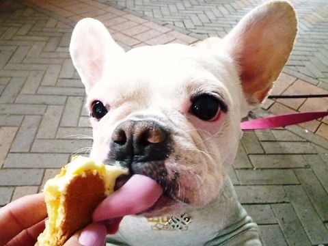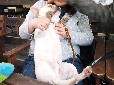 フレンチブルドッグhippieの肉球の上でコロコロ転がされる