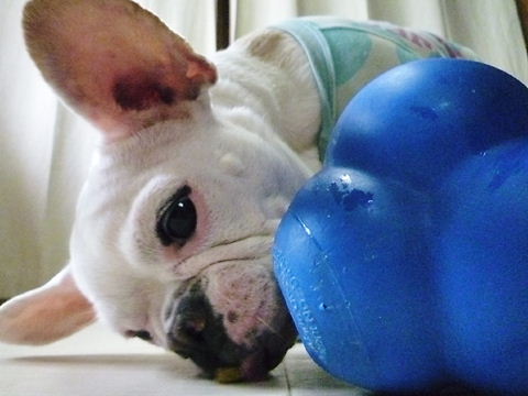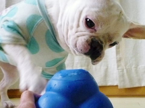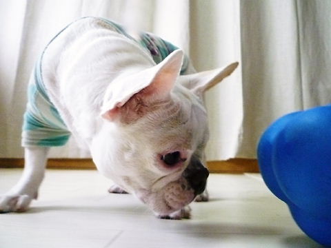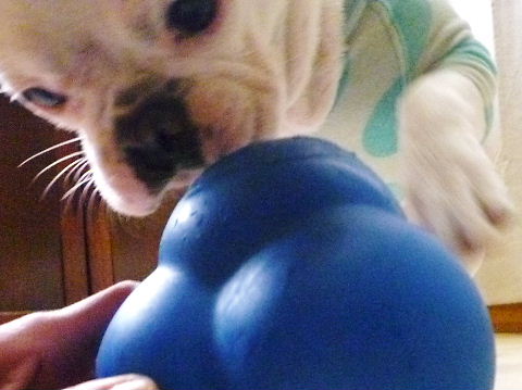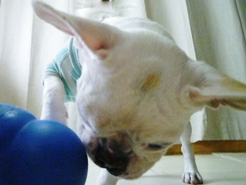 フレンチブルドッグhippieの肉球の上でコロコロ転がされる