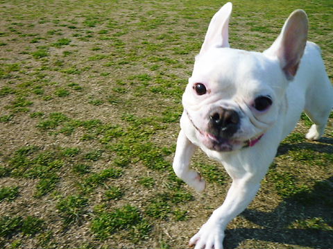 フレンチブルドッグhippieの肉球の上でコロコロ転がされる