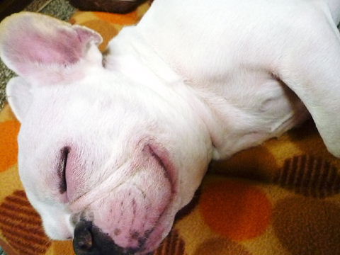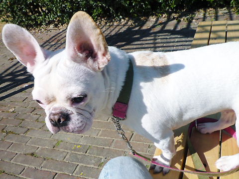 フレンチブルドッグhippieの肉球の上でコロコロ転がされる