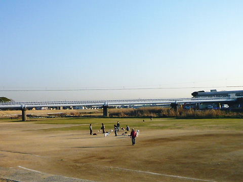 こむかりさんが、堤防の上を自転車で通過。