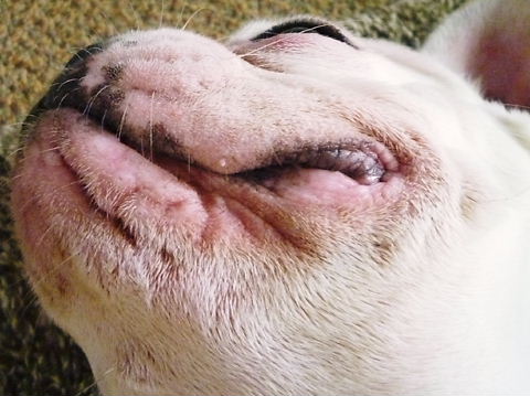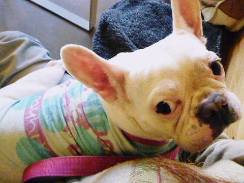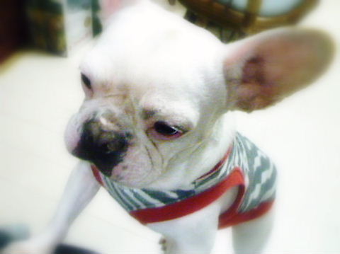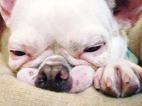 フレンチブルドッグhippieの肉球の上でコロコロ転がされる