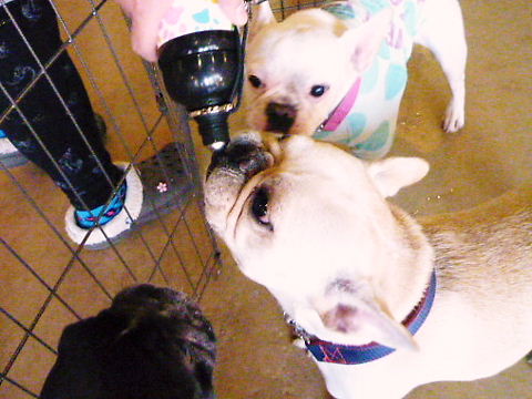 しばらく遊んで、給水中…ライチの水入れを、みんなでガン見❤