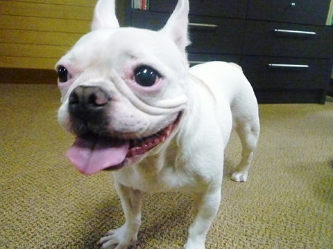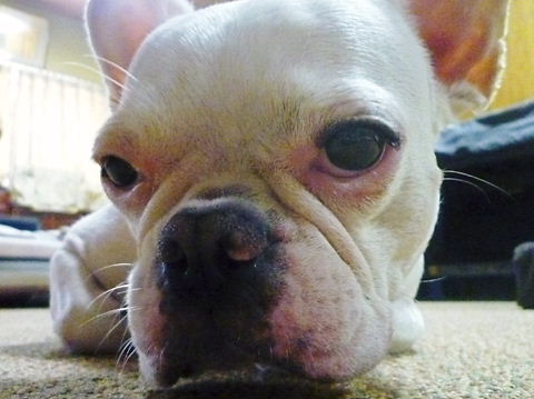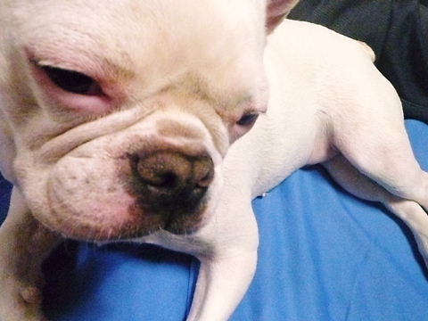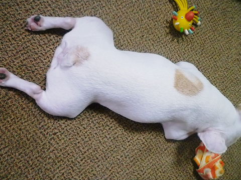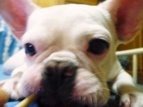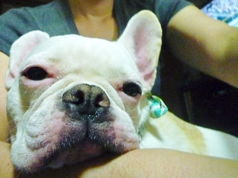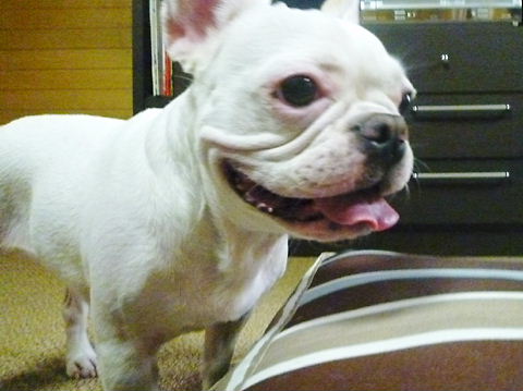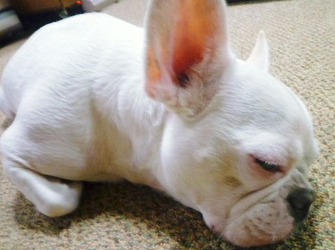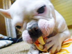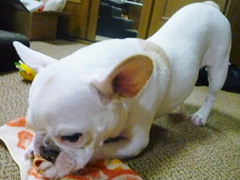 フレンチブルドッグhippieの肉球の上でコロコロ転がされる