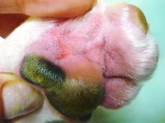 ジュクジュクでは無いけど、全部の肉球の間にティートゥリーオイル!