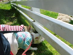 って手本を見せて、柵の下から
