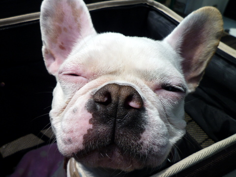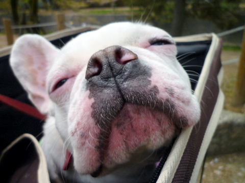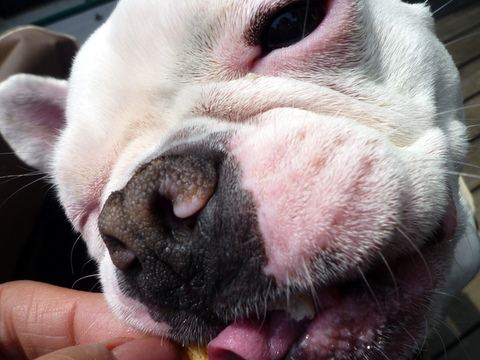 フレンチブルドッグhippieの肉球の上でコロコロ転がされる