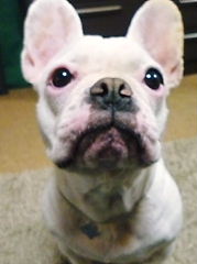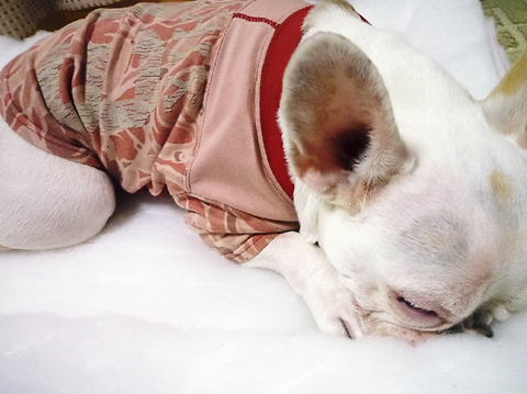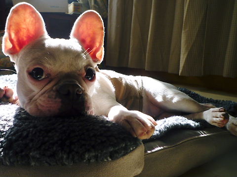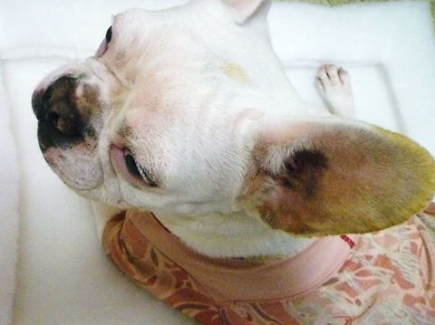フレンチブルドッグhippieの肉球の上でコロコロ転がされる